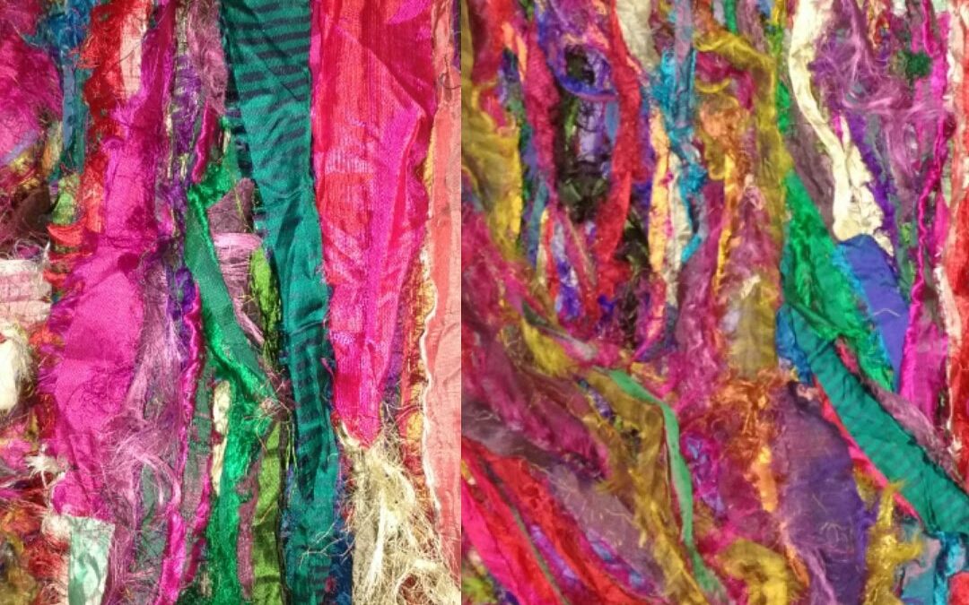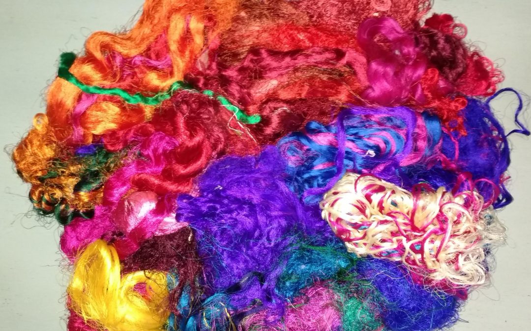 The leftover fabric scraps from silk Sari fabric has all kinds of uses for fibre artists, including spinners, knitters, felters, paper makers and others. Beautiful vibrant colours. Sold by the gram